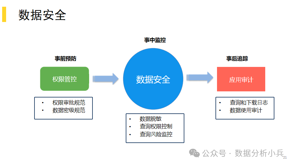 4、数据安全控制弱: 数据生产和查询权限无统—规则,数据密级无统—管理;
