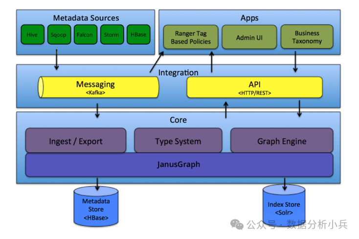 •Graph Engine图引擎:在内部,Atlas使用图模型持久化管理的元数据对象。这种方法提供了极大的灵活性,并能够有效地处理元数据对象之间的丰富关系。图形引擎组件负责Atlas类型系统的类型和实体之间的转换,以及底层图形持久化模型。除了管理图形对象外,图形引擎还为元数据对象创建适当的索引,以便可以有效地搜索它们。Atlas使用JanusGraph来存储元数据对象。