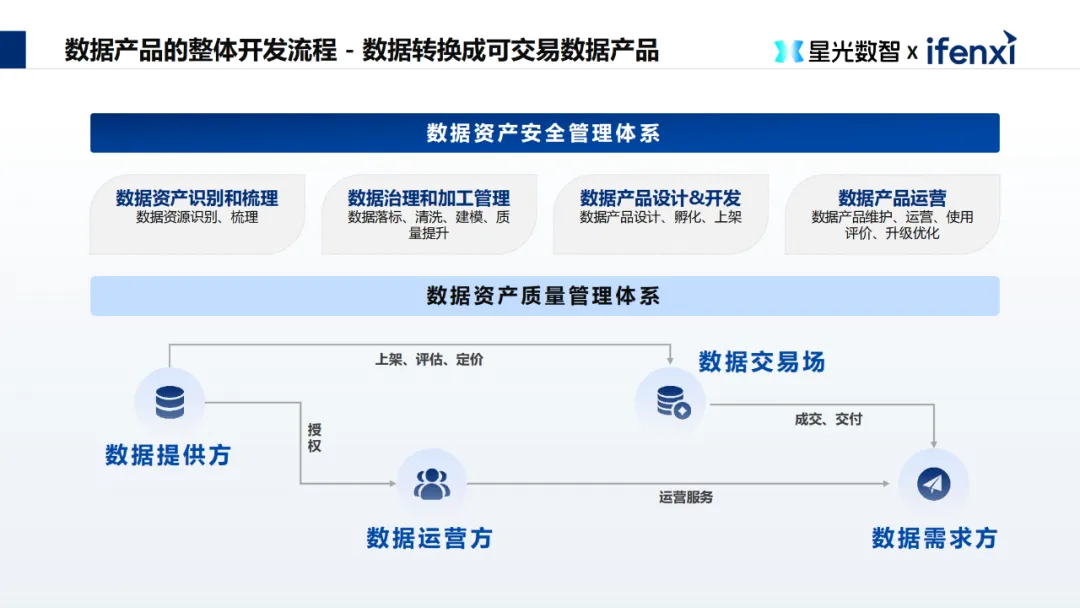 其中数据开发流程涉及到四方,数据提供方就是对数据直接应用的企业。数据运营方更多是我们这样一个角色,被授权去做数据的运营,基于甲方数据根据行业和其他对于数据的需求去做加工和处理,最终输出数据产品。另一方是数据交易场,我们把数据产品发布到数据交易平台,产生实际效益,来带实际的业务收入。最后数据需求方,梳理产品我们都是以数据需求方的意向为牵引来设计的,确保设计的产品满足数据需求方,为他们带来真正的价值。