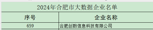 近日,合肥市数据资源管理局公示了2024年度合肥市大数据企业名单,经企业申报、各市初审推荐、专家评审、审查认定等程序,合肥创数信息科技有限公司被认定为“2024年度合肥市大数据企业”。